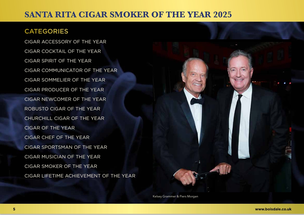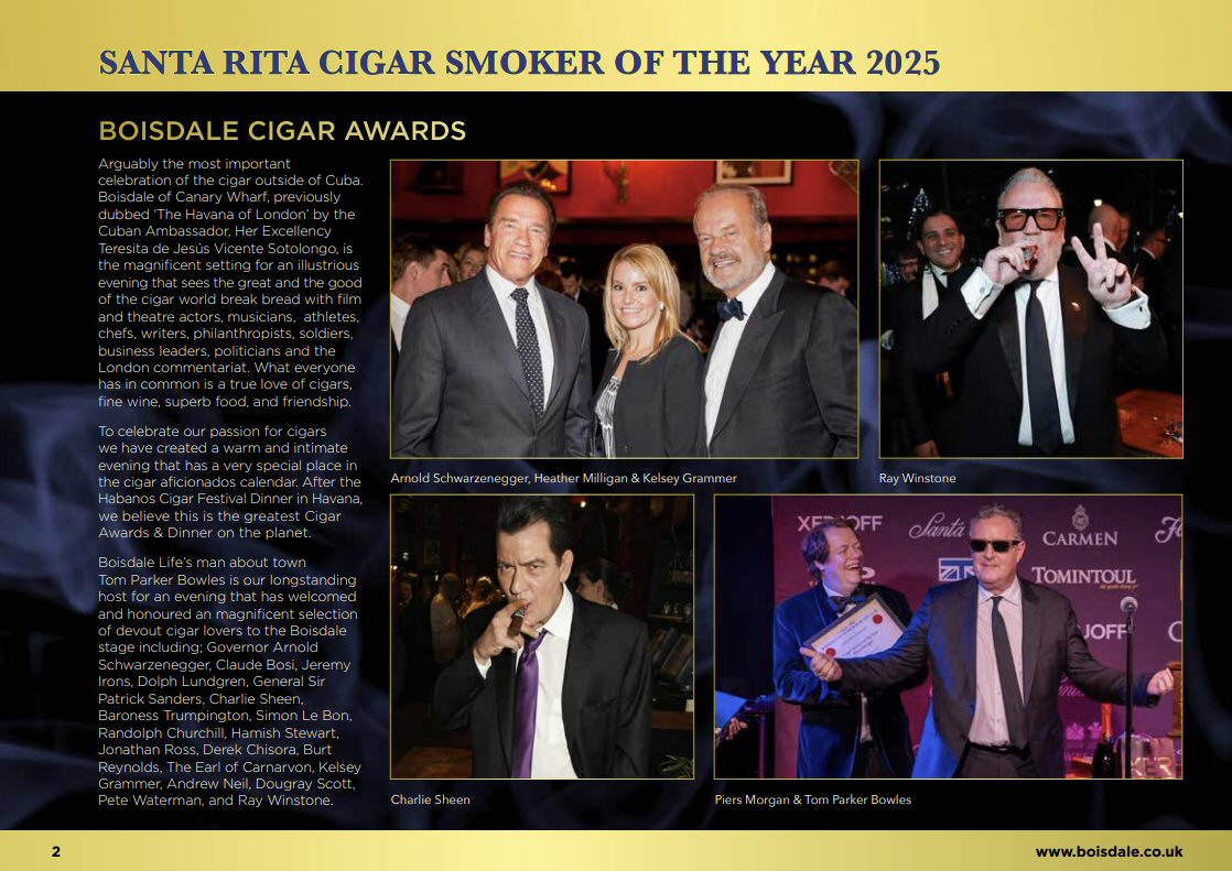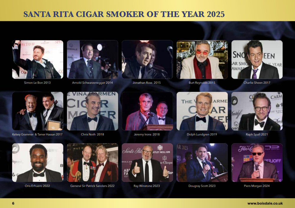 Previous winners have included Simon Le Bon, Arnold Schwarzenegger, Baroness Trumpington, Burt Reynolds, Jonathan Ross, Kelsey Grammer, Andrew Neil, Charlie Sheen, James Cosmo, Chris Noth, Jeremy Irons, Dolph Lundgren, Oris Erhuero & Piers Morgan. Join us to discover who will win The Cigar Smoker of the Year 2025.