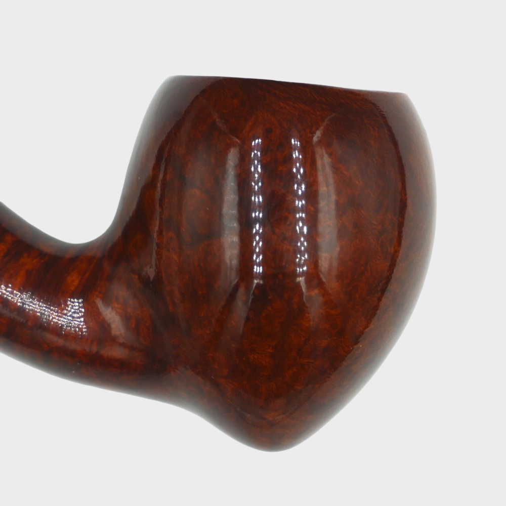 Elegant churchwarden type pipe with a rare bowl shape called "Acorn". Handmade in the workshop near Przemysl, Poland from Italian briar of extra class (Mimmo). Lightweight, graceful and enticing in its appearance, the curved shank of the pipe is finished with a brass ring, the long ABS stem has a place for a removable condenser (tobacco in the pipe can be smoked without it).