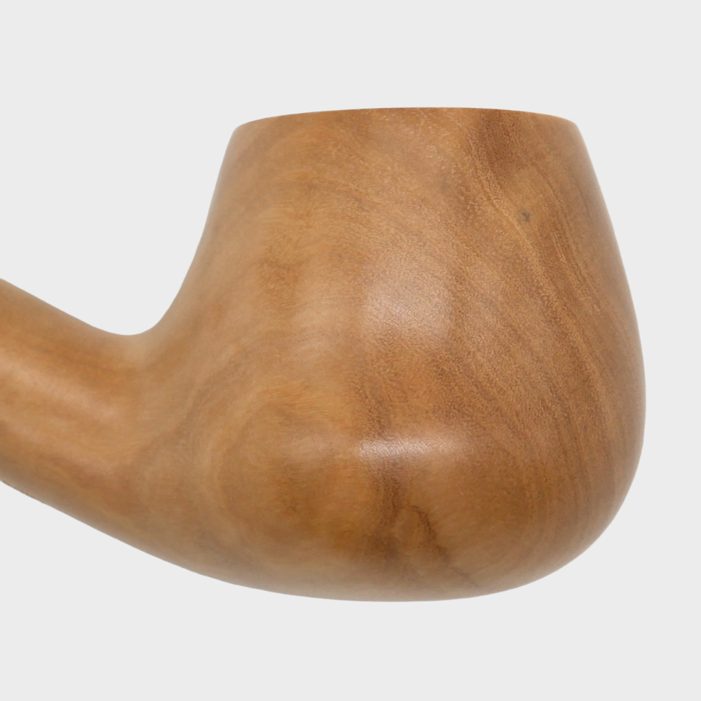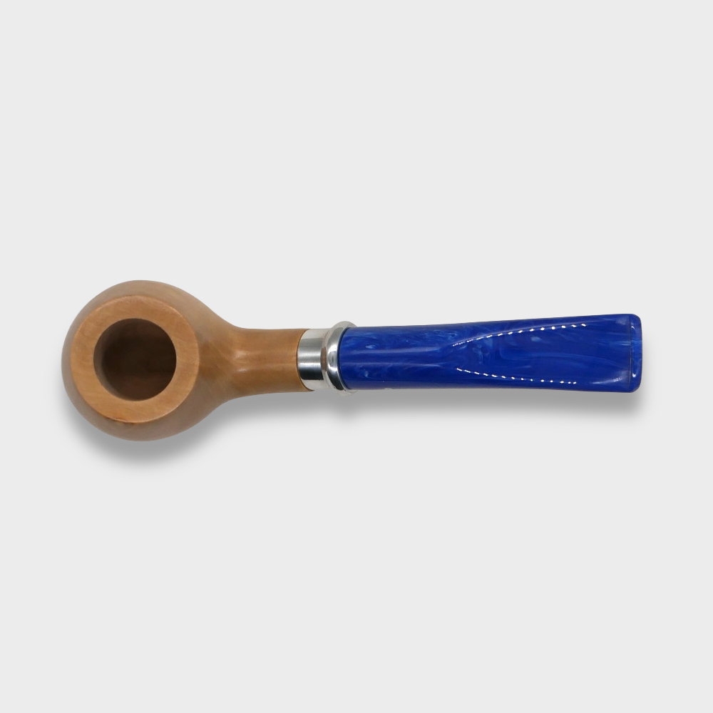 A one-of-a-kind, handcrafted pipe made from olive wood. The classic Bent Apple shape pairs beautifully with the natural warmth and grain of the olive wood, while the blue mouthpiece adds a distinctive finishing touch.
