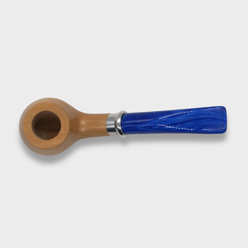 A one-of-a-kind, handcrafted pipe made from olive wood. The classic Bent Apple shape pairs beautifully with the natural warmth and grain of the olive wood, while the blue mouthpiece adds a distinctive finishing touch.