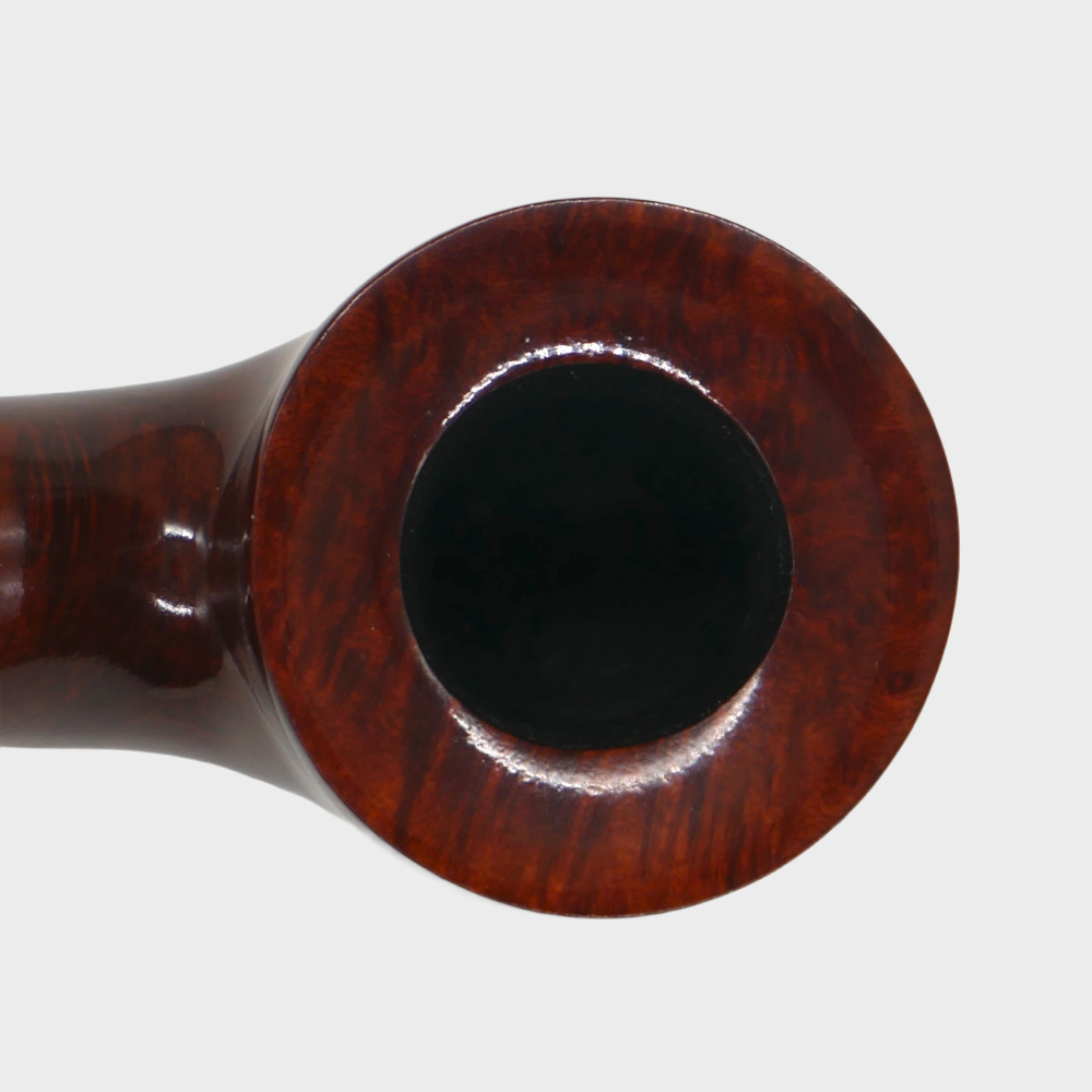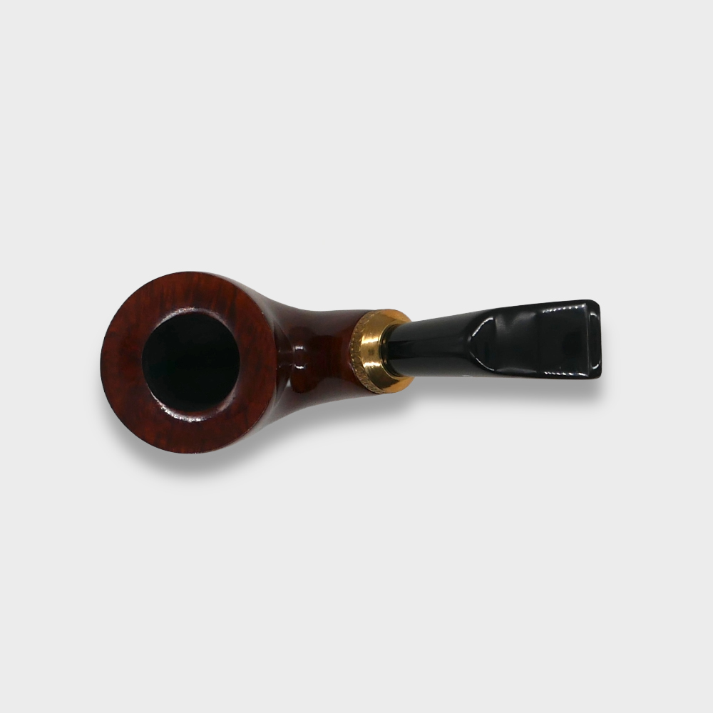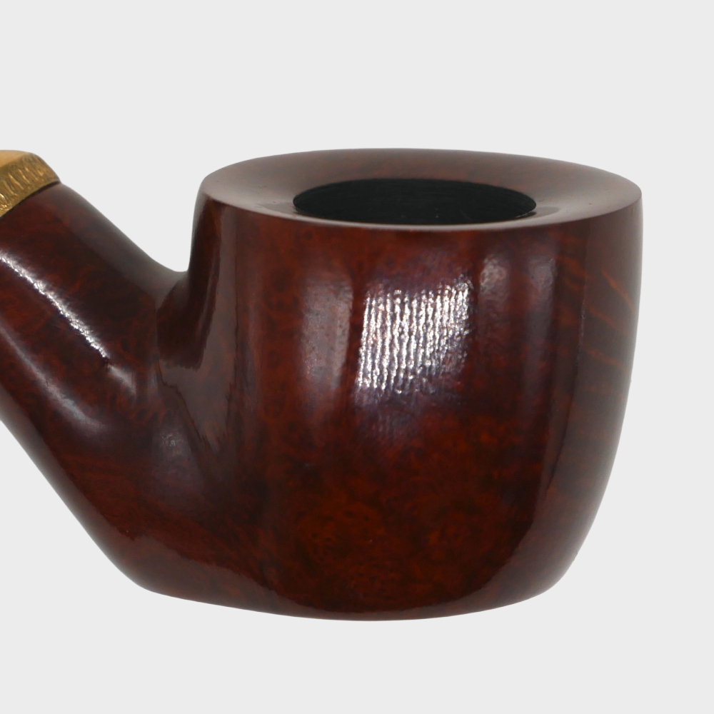 A compact yet unexpectedly roomy tobacco pipe, hand-made from Italian briar. It features a small pipe design with a flat-bottom bowl for stability.