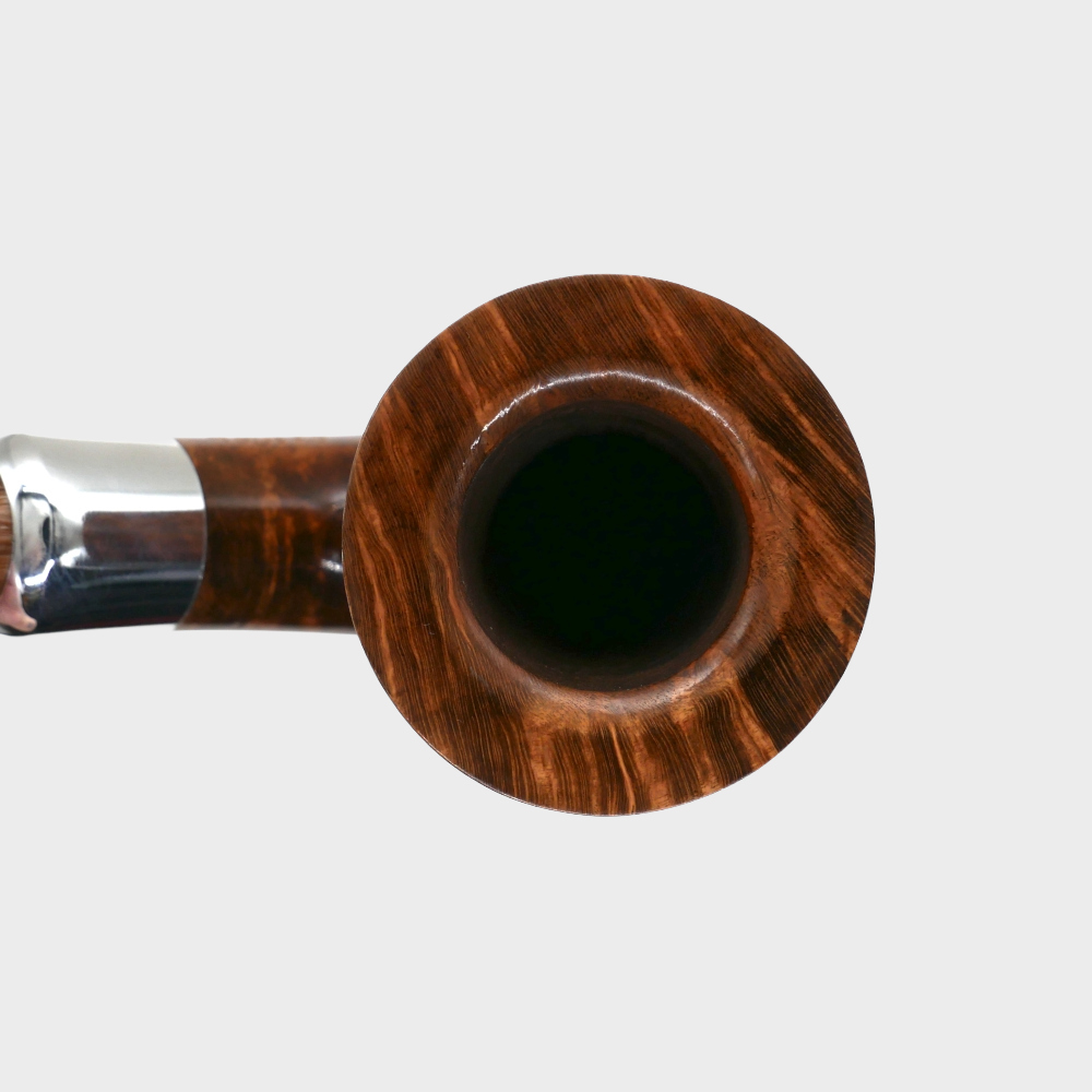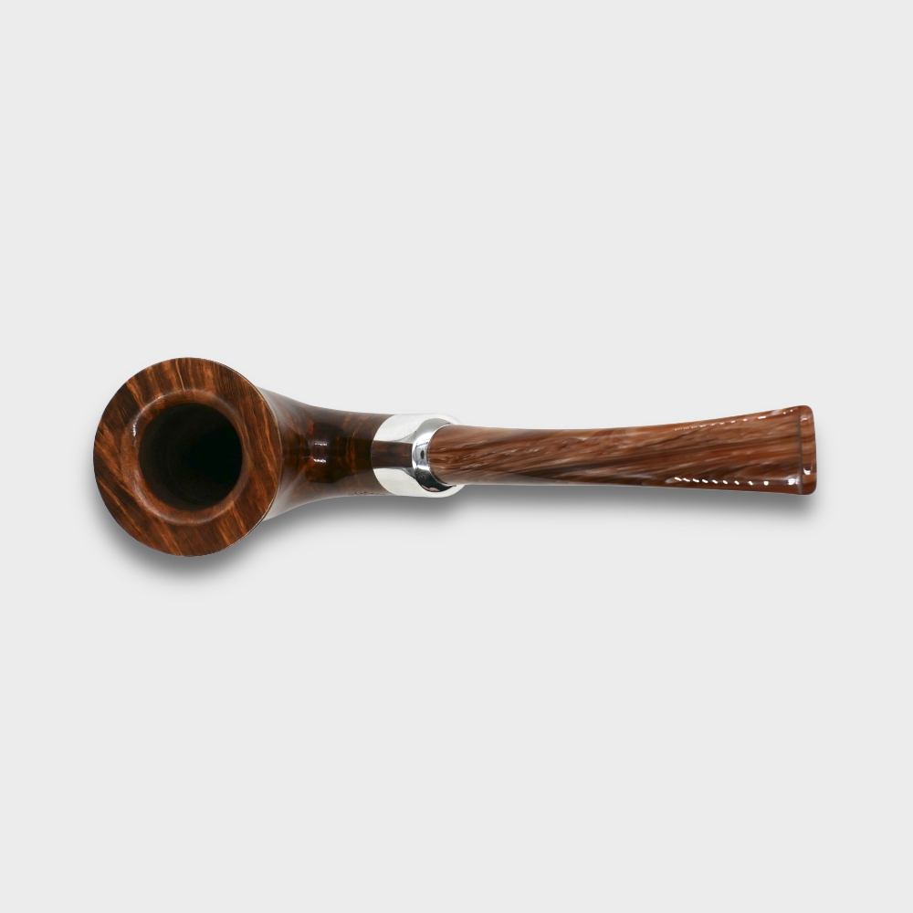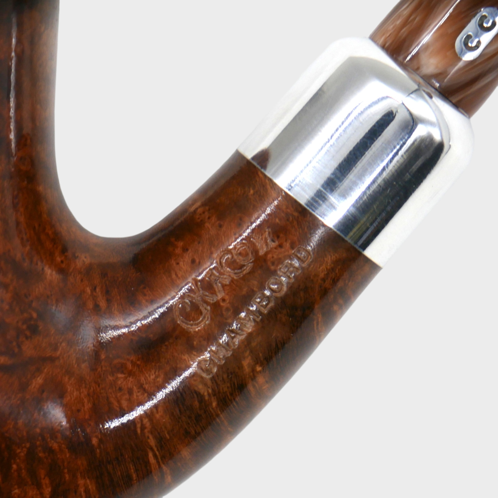 The natural varnished finish of the Chacom Chambord highlights the unique grain of the briar, adding an authentic and warm charm to any room. Its stem is finished with an elegant aluminium ferrule , enhancing the overall design and adding a touch of originality. The marbled, café-crème acrylic stem , fitted for a 9mm filter , ensures a smooth smoke and optimal comfort.