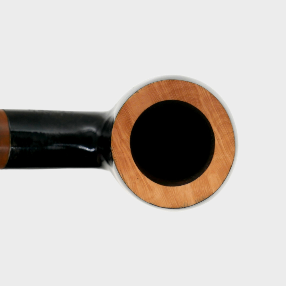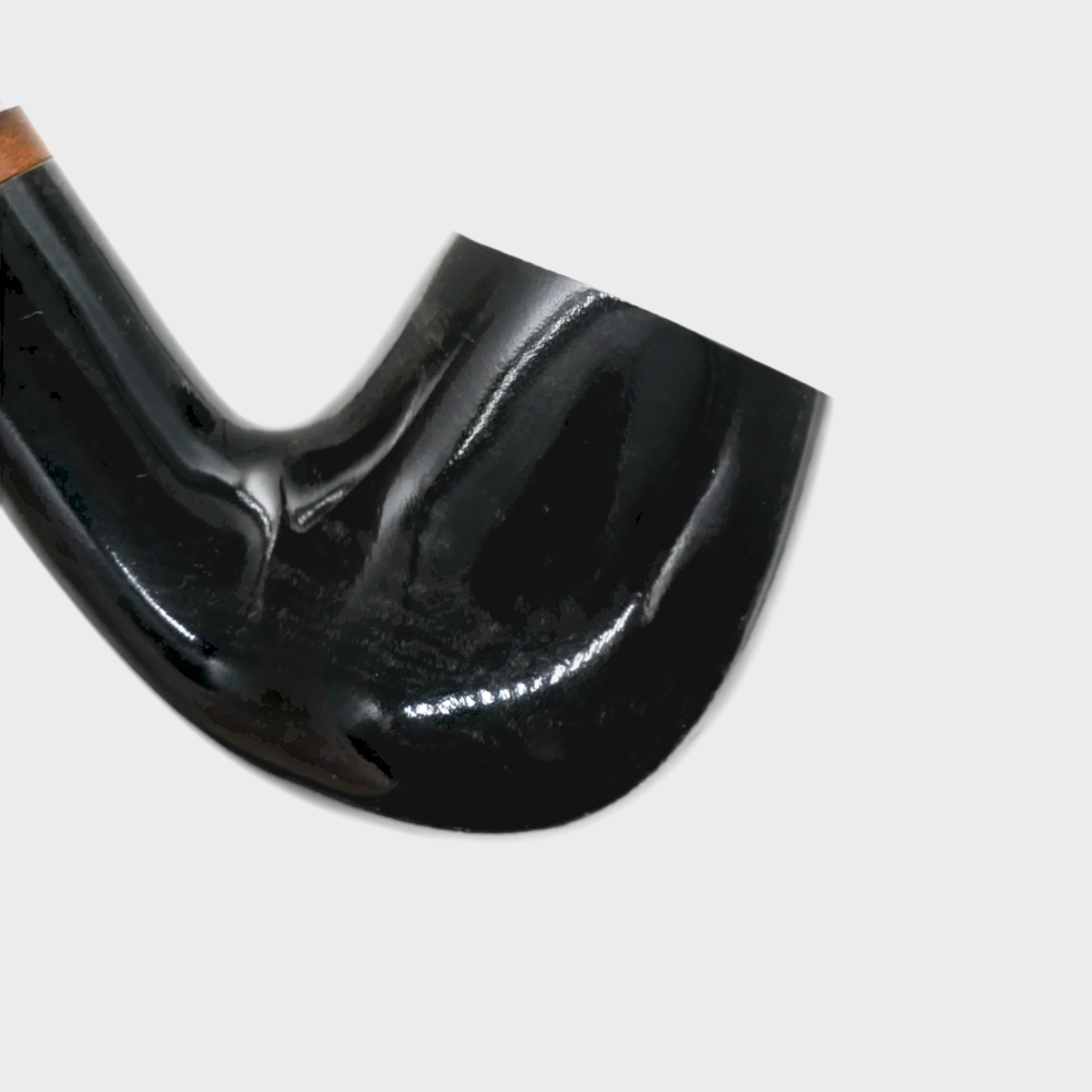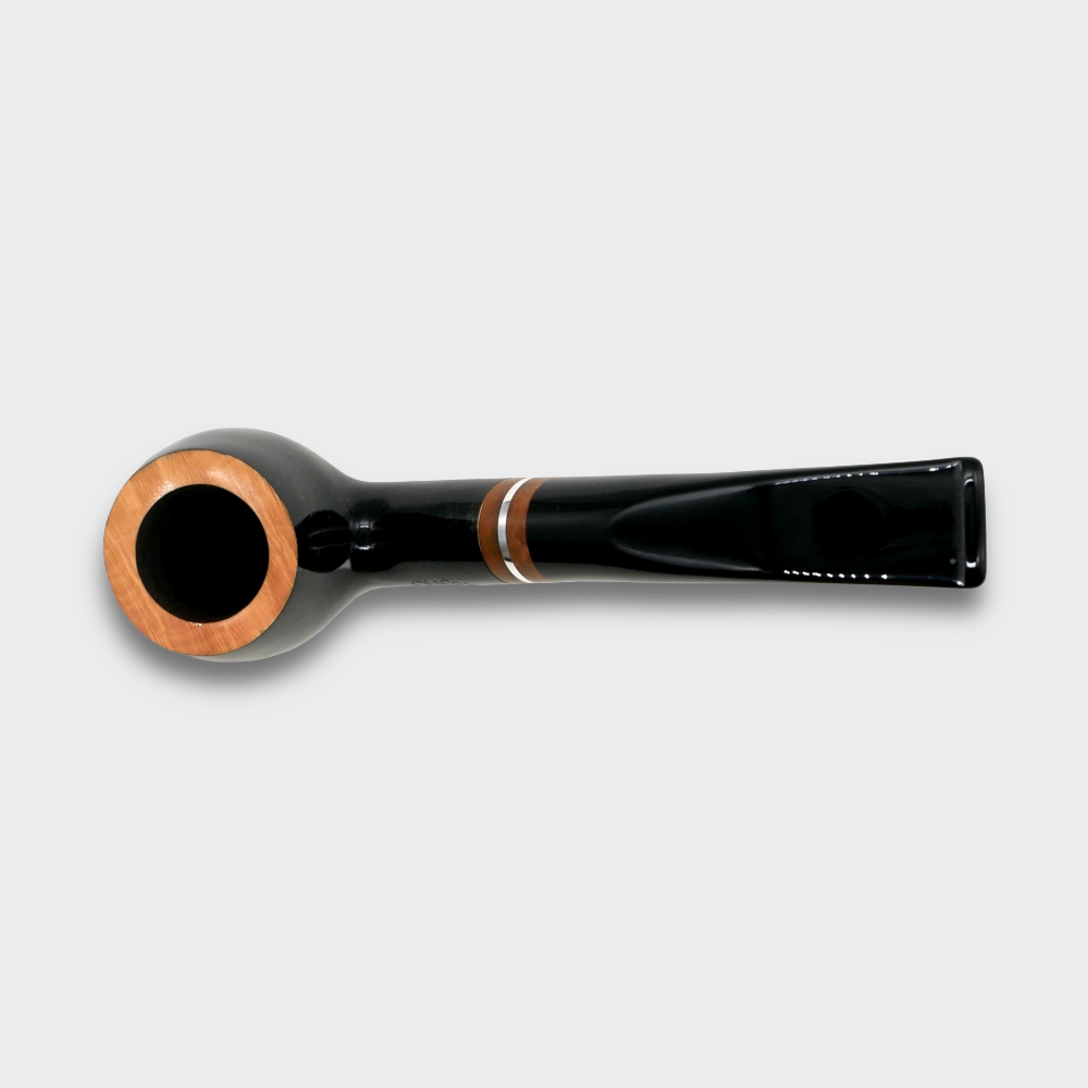 A beautiful bent pipe with a black contrasted finish, a natural top and a stylish double band made from briar and chrome. Well-balanced, the popular "bent apple" shape of this briar pipe offers a comfortable grip.