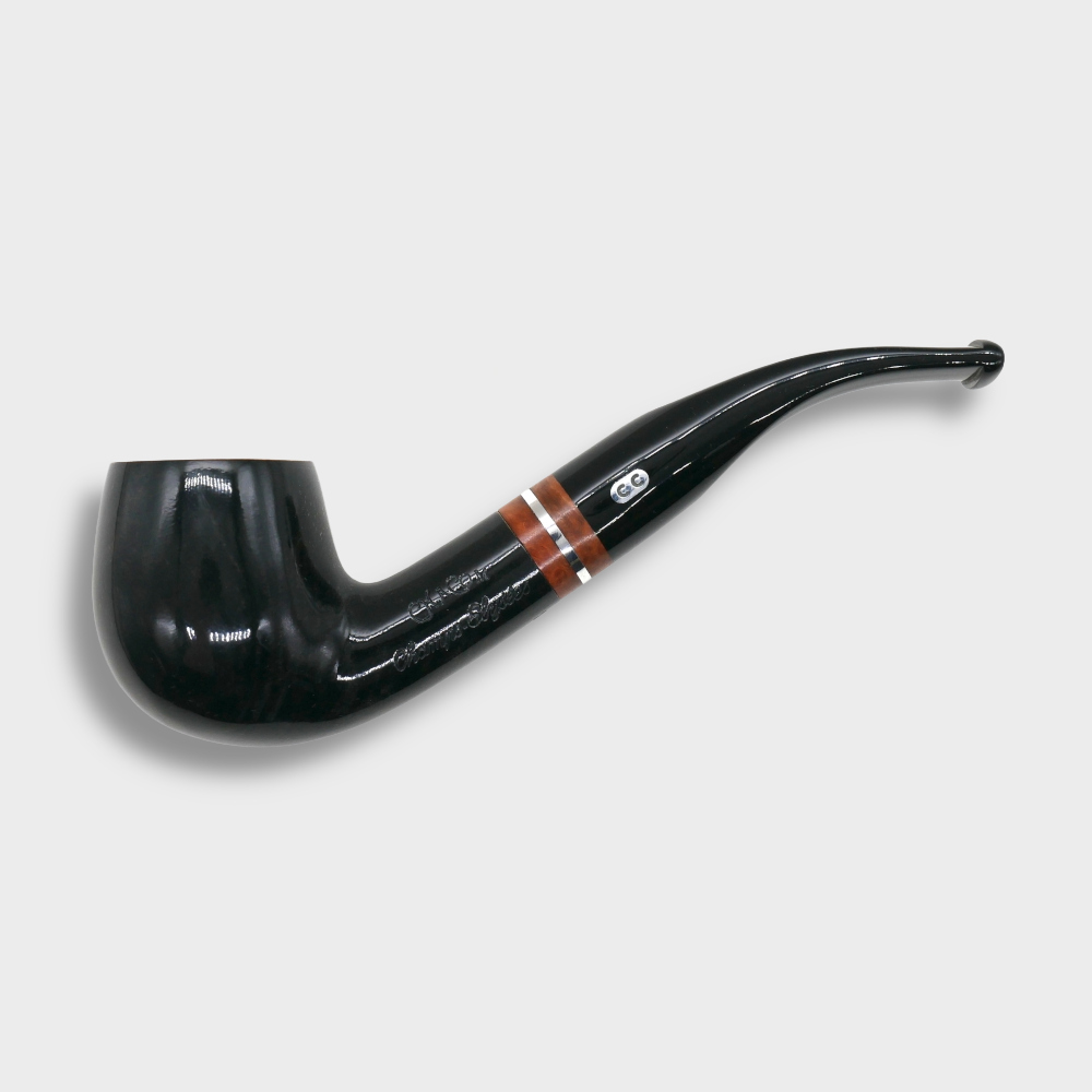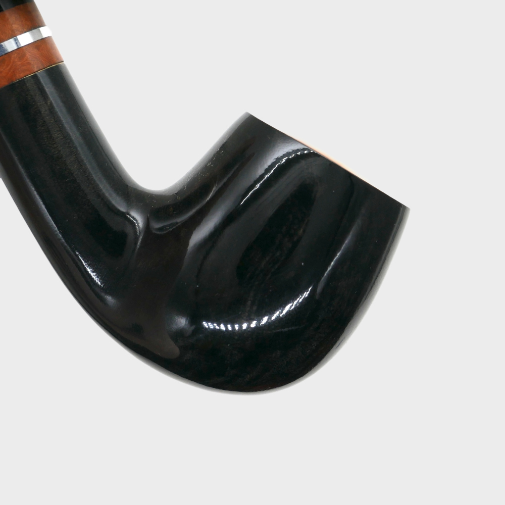 A beautiful bent pipe with a black contrasted finish, a natural top and a stylish double band made from briar and chrome. Well-balanced, the popular "bent apple" shape of this briar pipe offers a comfortable grip.