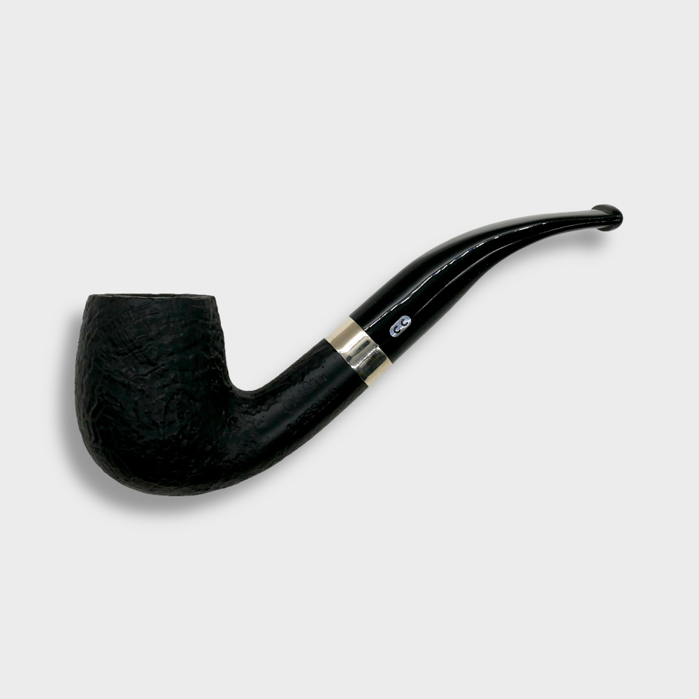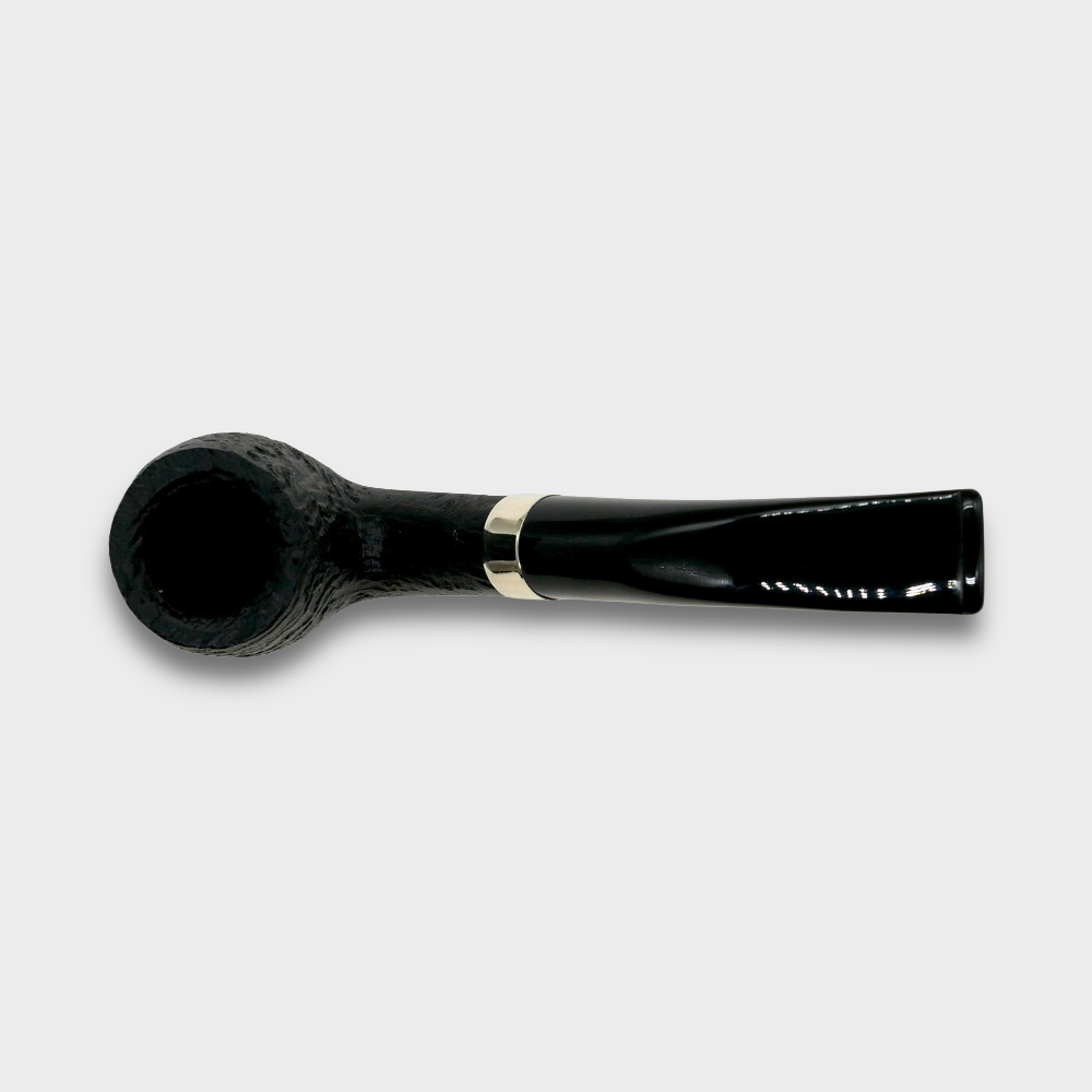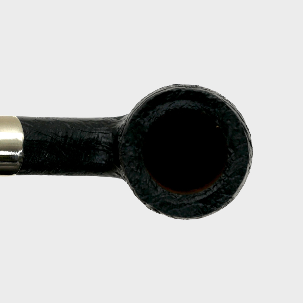 A classic pipe with a sandblasted black finish. This pipe features a beautiful nickel band to make a smooth transition between the shank and the stem.