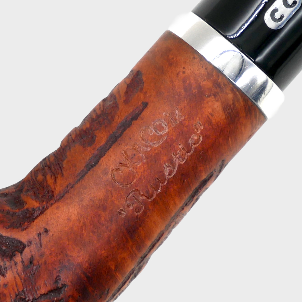 An original pipe with a rusticated finish and a cumberland-like acrylic stem for a perfect rustic look.