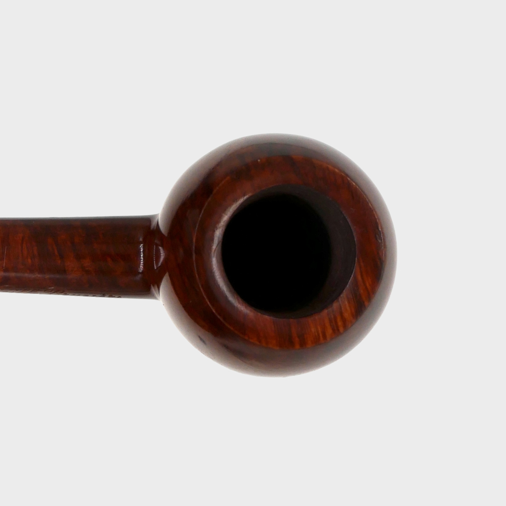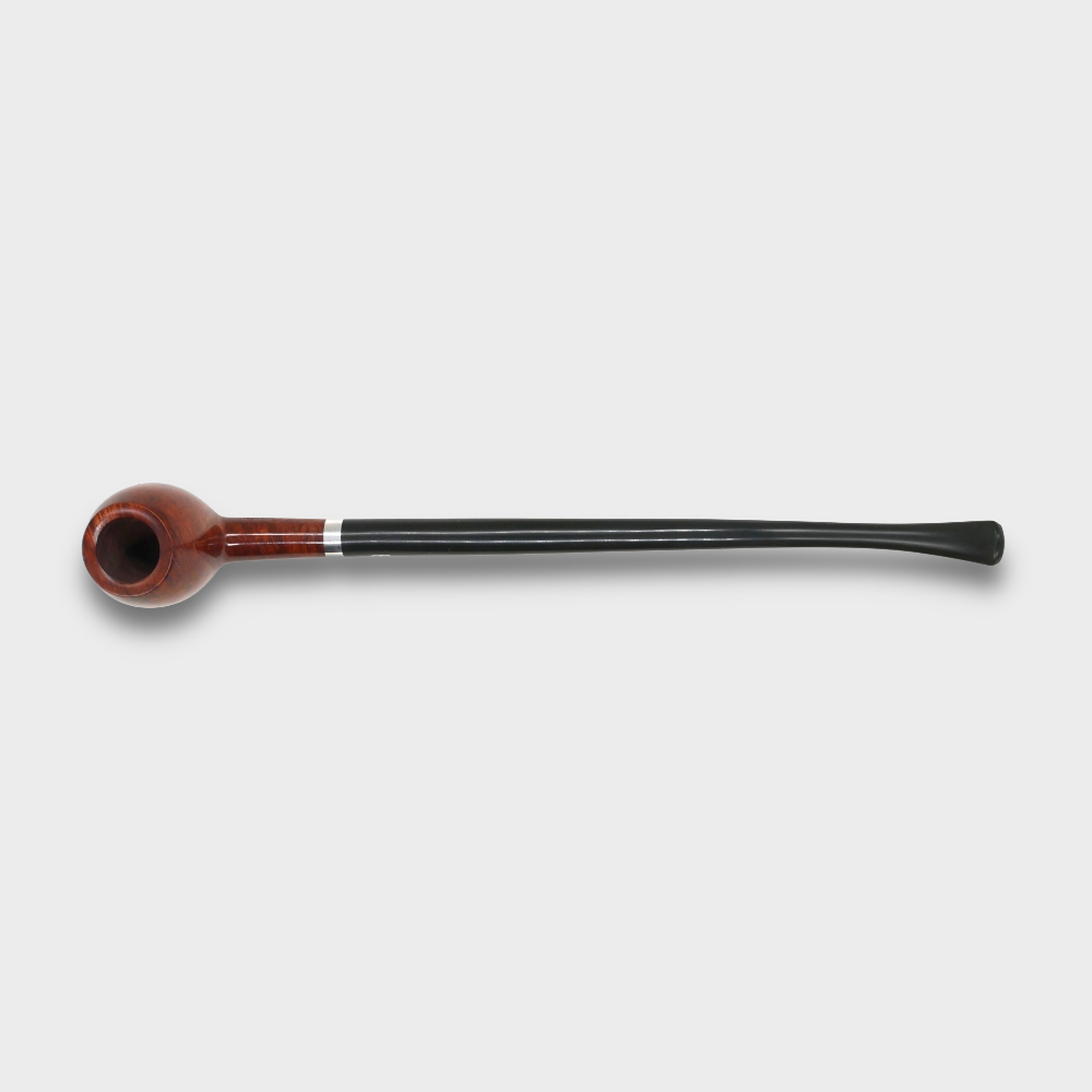 A long briar pipe with a classic apple shape and a mahogony finish, made from an aged briar (70 years old and more). Its long vulcanite and fishtail mouthpiece is equipped with a chrome band.