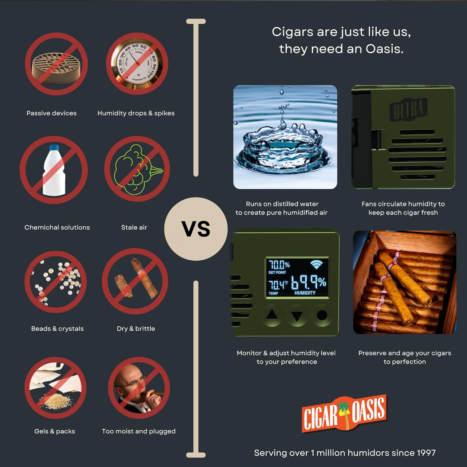 The Cigar Oasis Ultra 4.0 takes all the worry and fuss out of storing and maintaining your precious collection.
