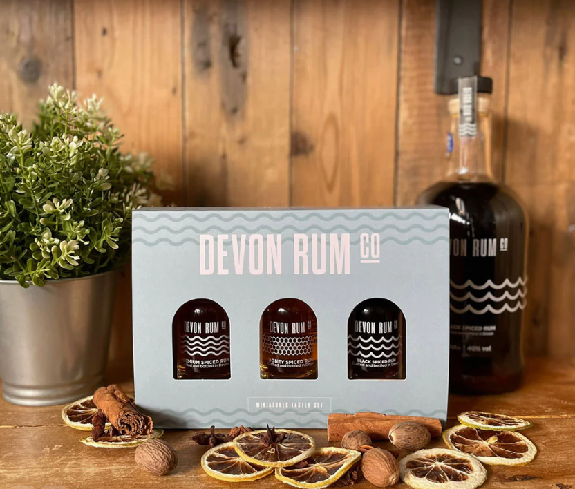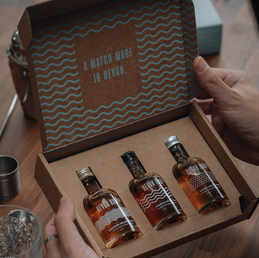 This stylish gift set features a 5cl bottle of Premium Spiced, Honey Spiced, and Black Spiced Rums - presented in a nifty gift box with a sleek Devon Rum Co sleeve.