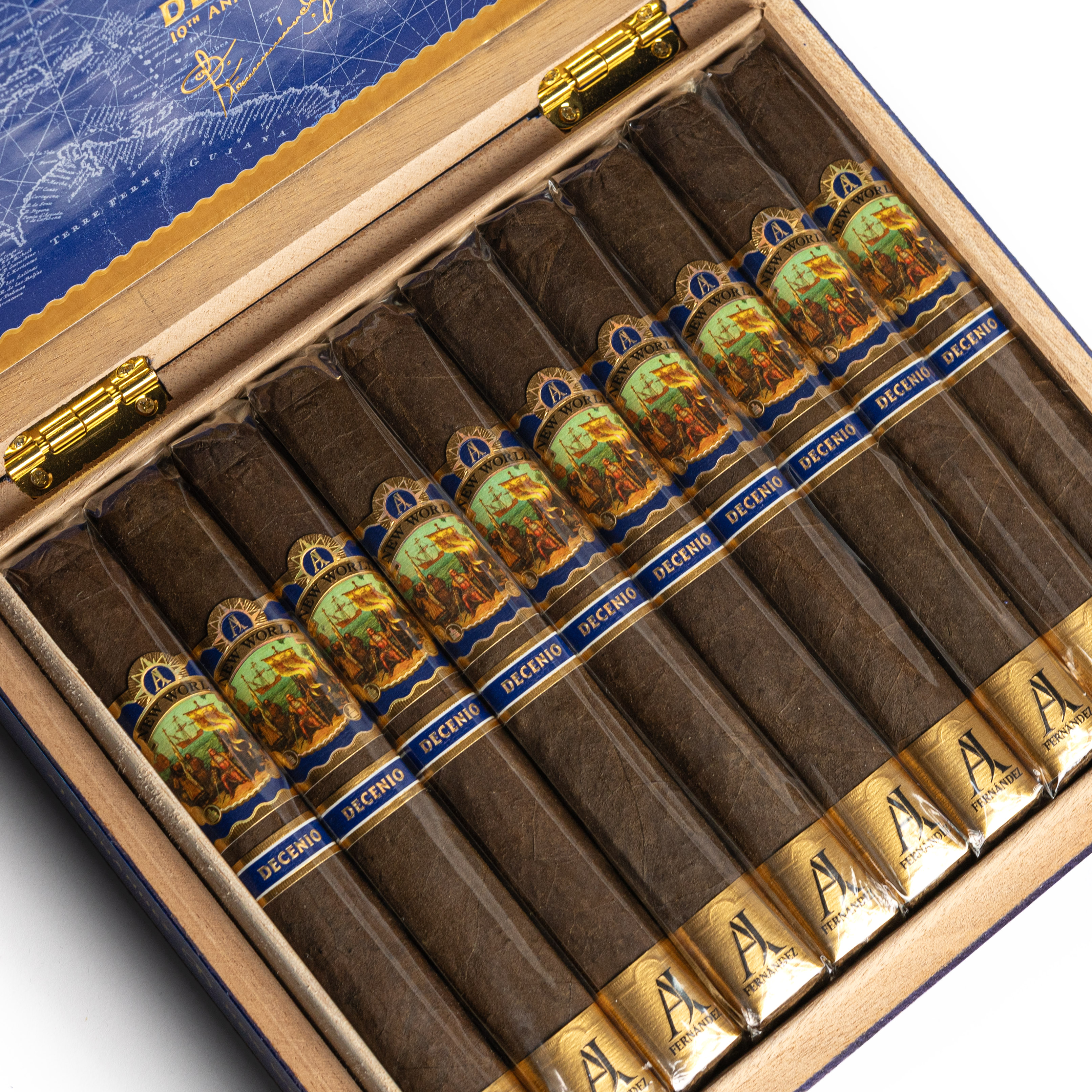 New World Decenio commemorates a decade of legacy, tradition and passion. In the years of pioneering his own company, AJ alongside his father, Ismael developed the New World brand with the intention of illuminating AJ's distinct blending style and to pay respect to his roots in tobacco. New World quickly became the foundation to the copany's recognition and growth, and today remains the most acclaimed brand in the AJ Fernandez portfolio. Decenio is a gleaming testament to hard work, a celebration of origins and a glimpse into everything yet to come.
