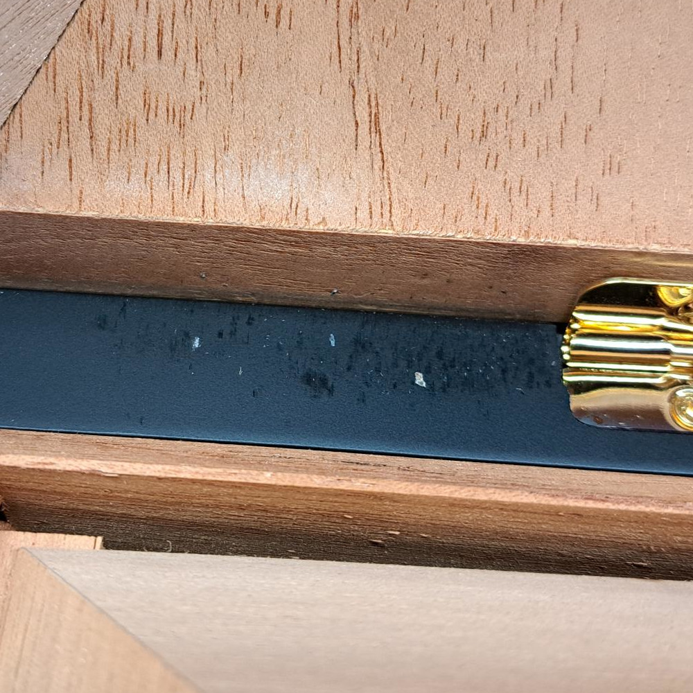 PLEASE NOTE: there is slight damage to the inner rim by the hinge, and some wood damage. This should not affect the use of the humidor. See final images for close ups.