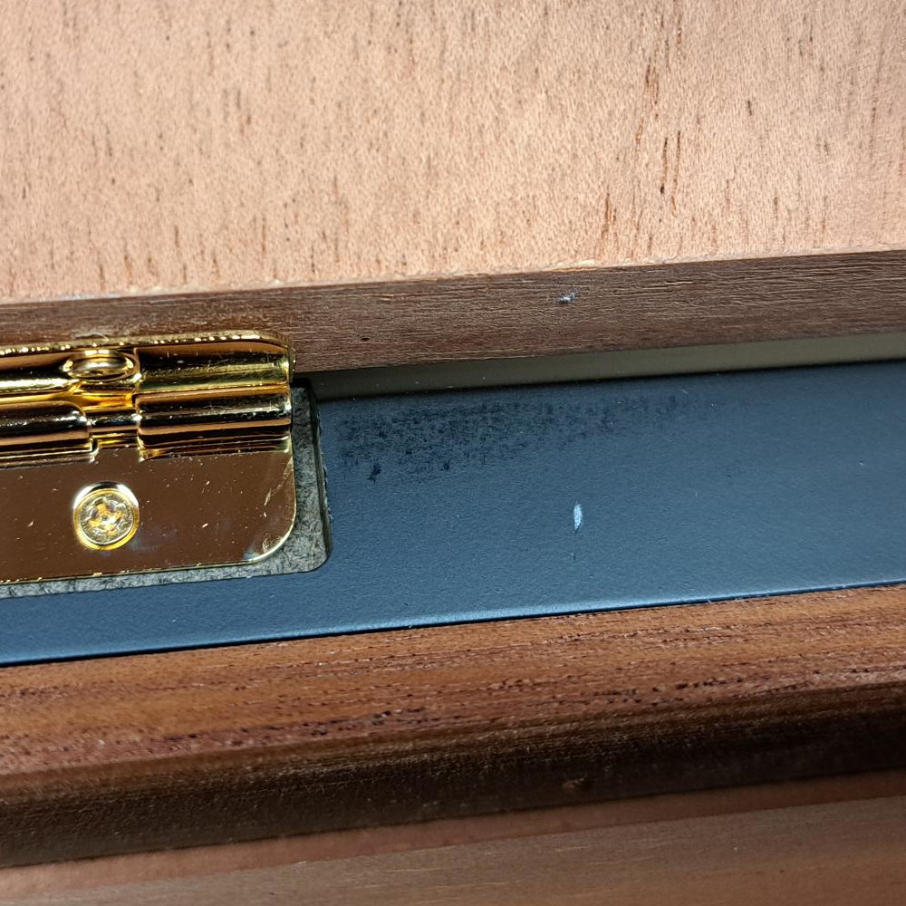 PLEASE NOTE: the right hand hinge is loose, 2 areas of white cuffing and slight damage to the wood. This should not affect the use of the humidor. See final images for close ups.