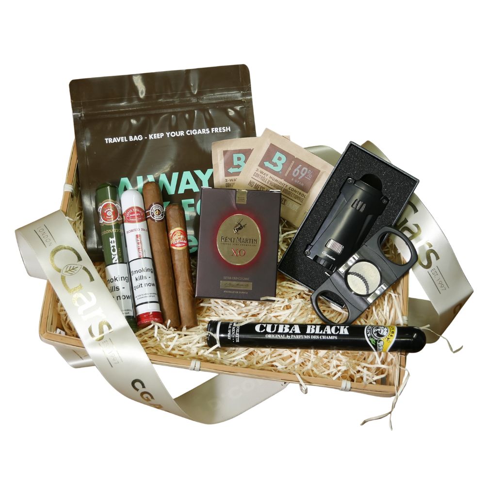 This hamper gift sampler makes the perfect Christmas present for any cigar lover, including all you need to cut and enjoy a wonderful cigar. Includes a selection of four Cuban cigars, along with a Remy Martin XO Cognac miniature, a Cigarism Lighter and Cigar Cutter, a Cuba Black aftershave and a couple of Boveda humidifying packs to keep your cigars in perfect condition over the Christmas period! We've also thrown in a FREE Boveda pouch with this sampler! All beautifully presented in a wicker basket complete with plastic wrap and ribbon!