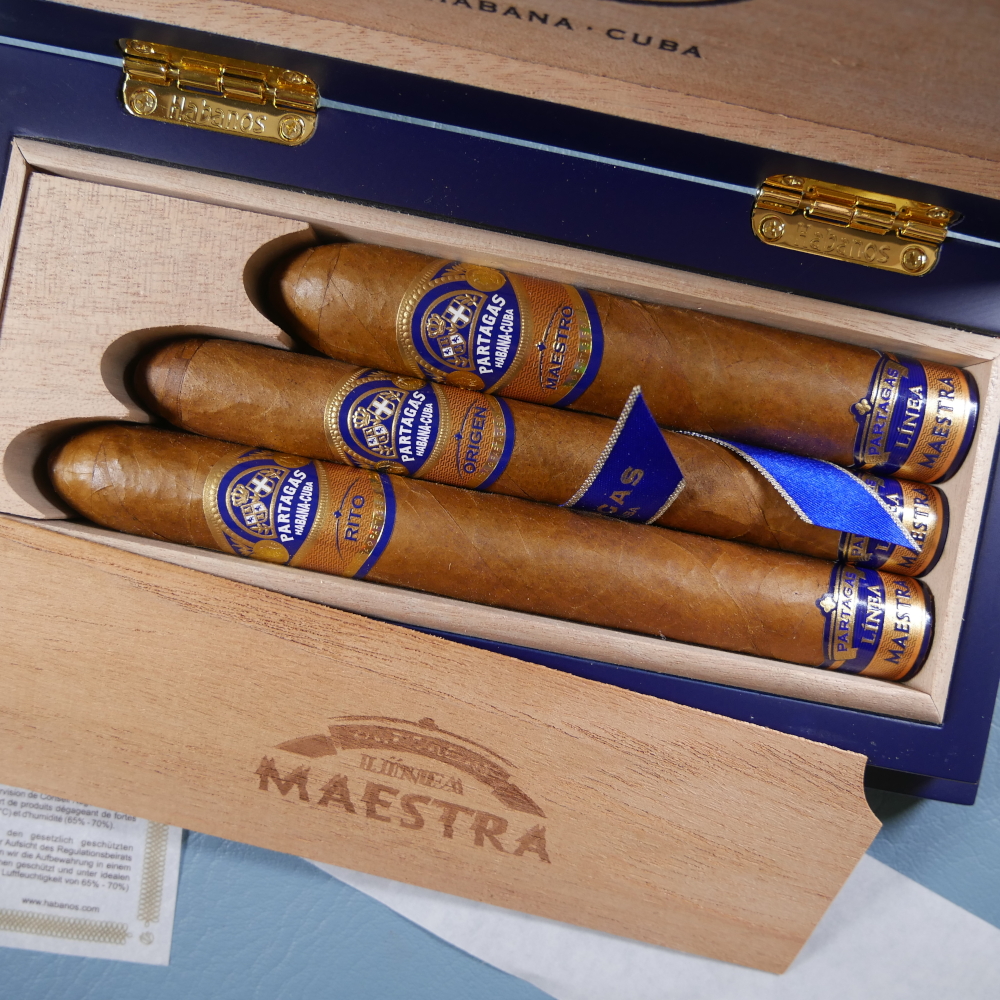 This stylish gift box includes three cigars, one each of the new Partagas Linea Maestras, introduced to the UK in October 2024.