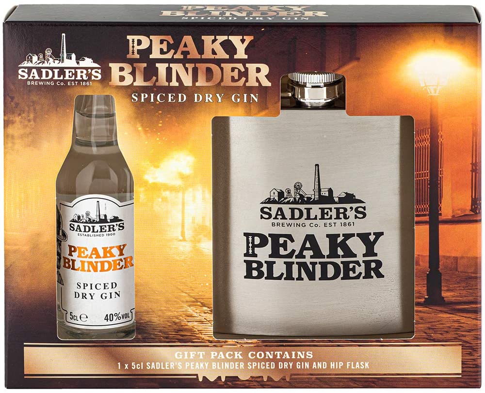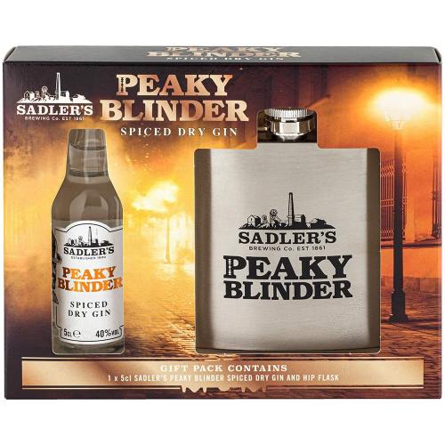 A Peaky Blinder Dry Spiced Gin 5cl and braded hip flask.