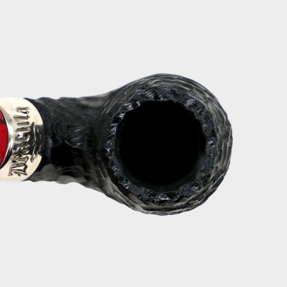 Sitting beautifully between the flawless black ebony bowl and the striking red and black marbled fishtail mouthpiece, there is a perfectly proportioned nickel band with the Dracula name etched on to it.
