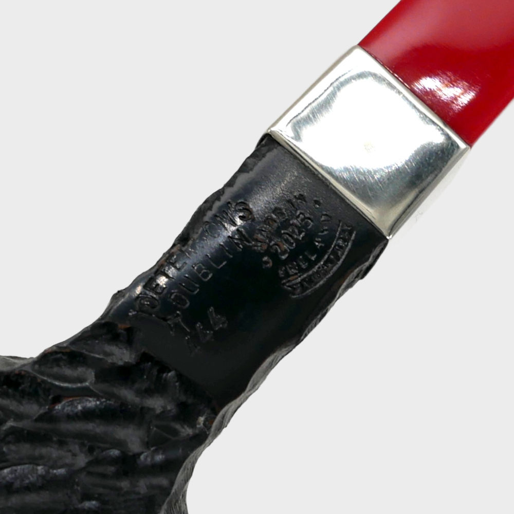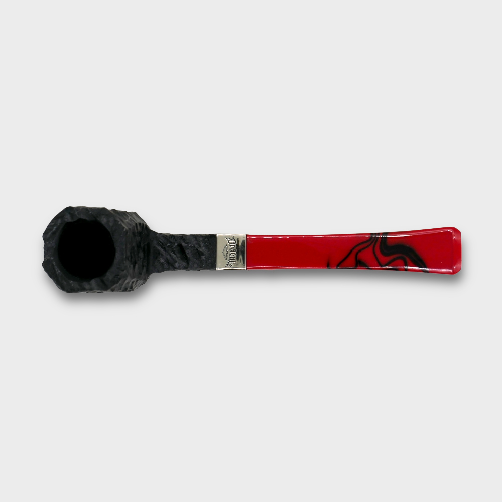Sitting beautifully between the flawless black ebony bowl and the striking red and black marbled fishtail mouthpiece, there is a perfectly proportioned nickel band with the Dracula name etched on to it.