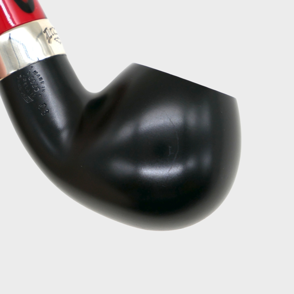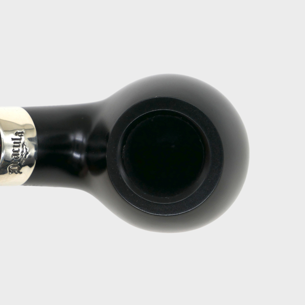 Sitting beautifully between the flawless black ebony bowl and the striking red and black marbled fishtail mouthpiece, there is a perfectly proportioned nickel band with the Dracula name etched on to it.