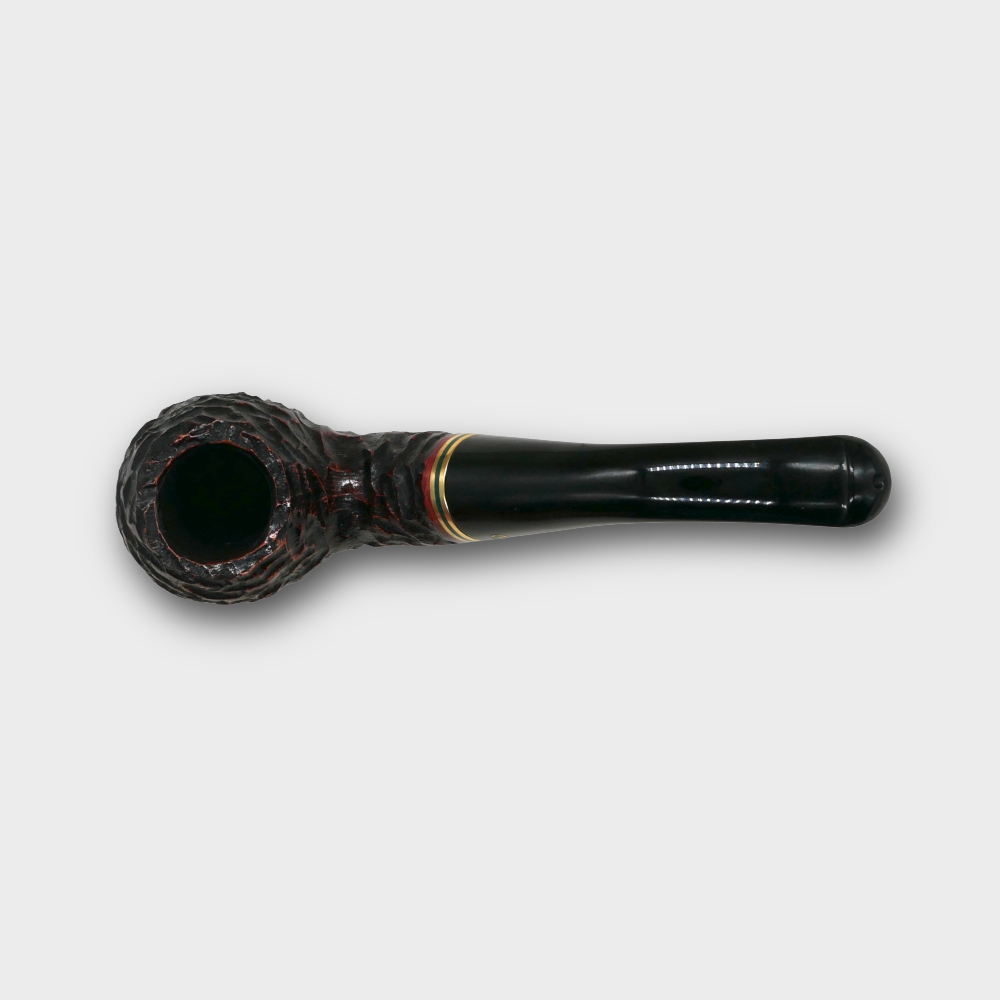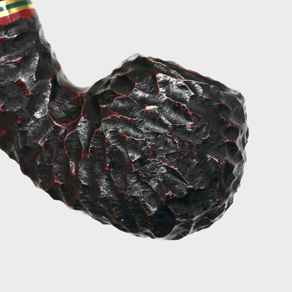 The Peterson Emerald Rustic Pipe range is made from specially selected hand carved briar in black with red hues and a twin gilt and emerald band.