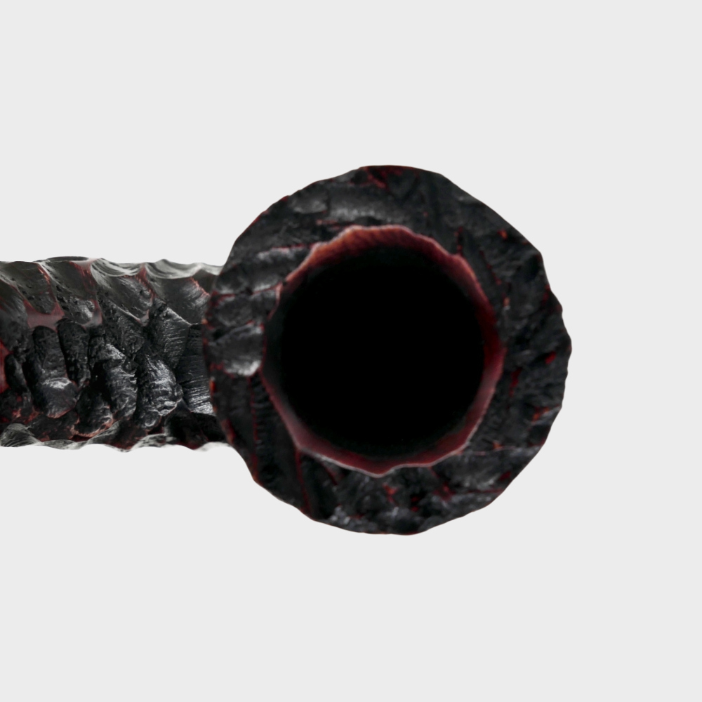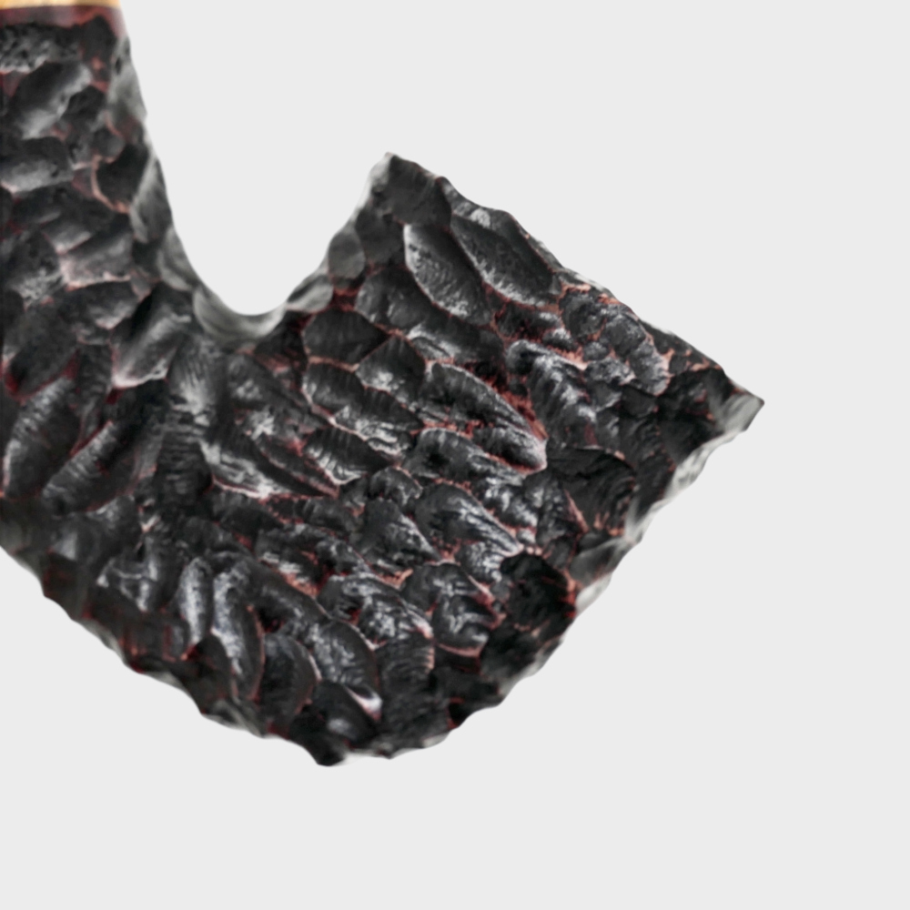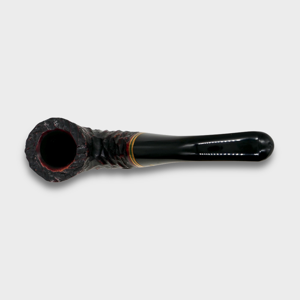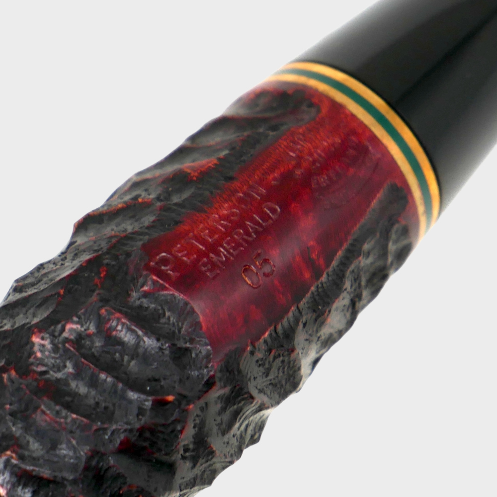 The Peterson Emerald Rustic Pipe range is made from specially selected hand carved briar in black with red hues and a twin gilt and emerald band.