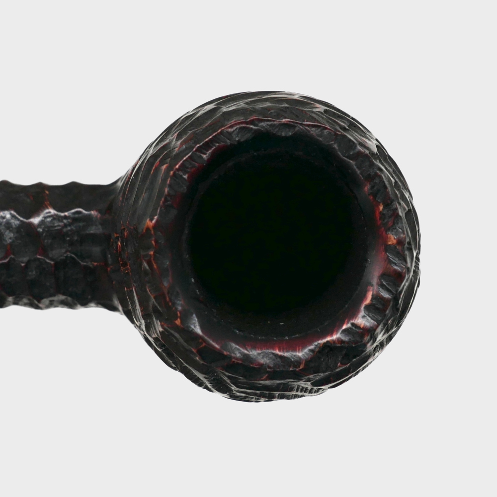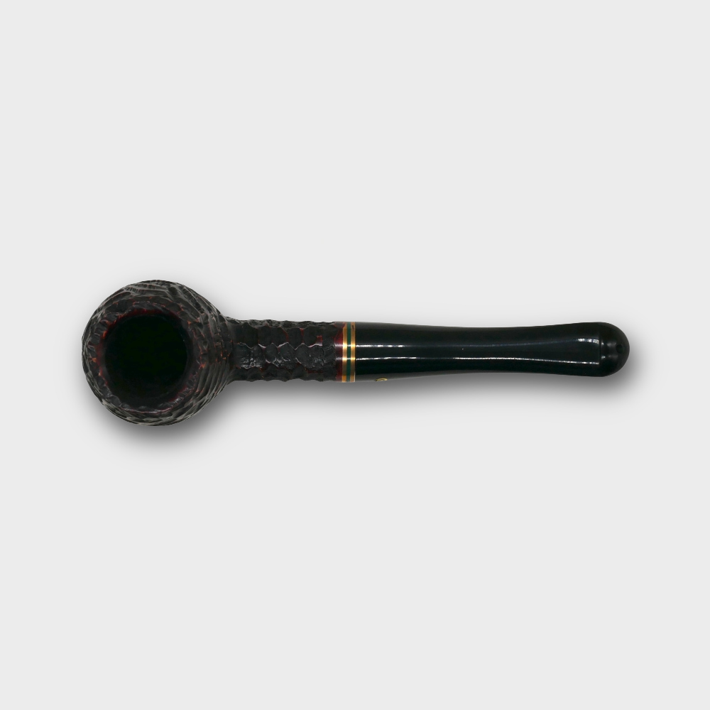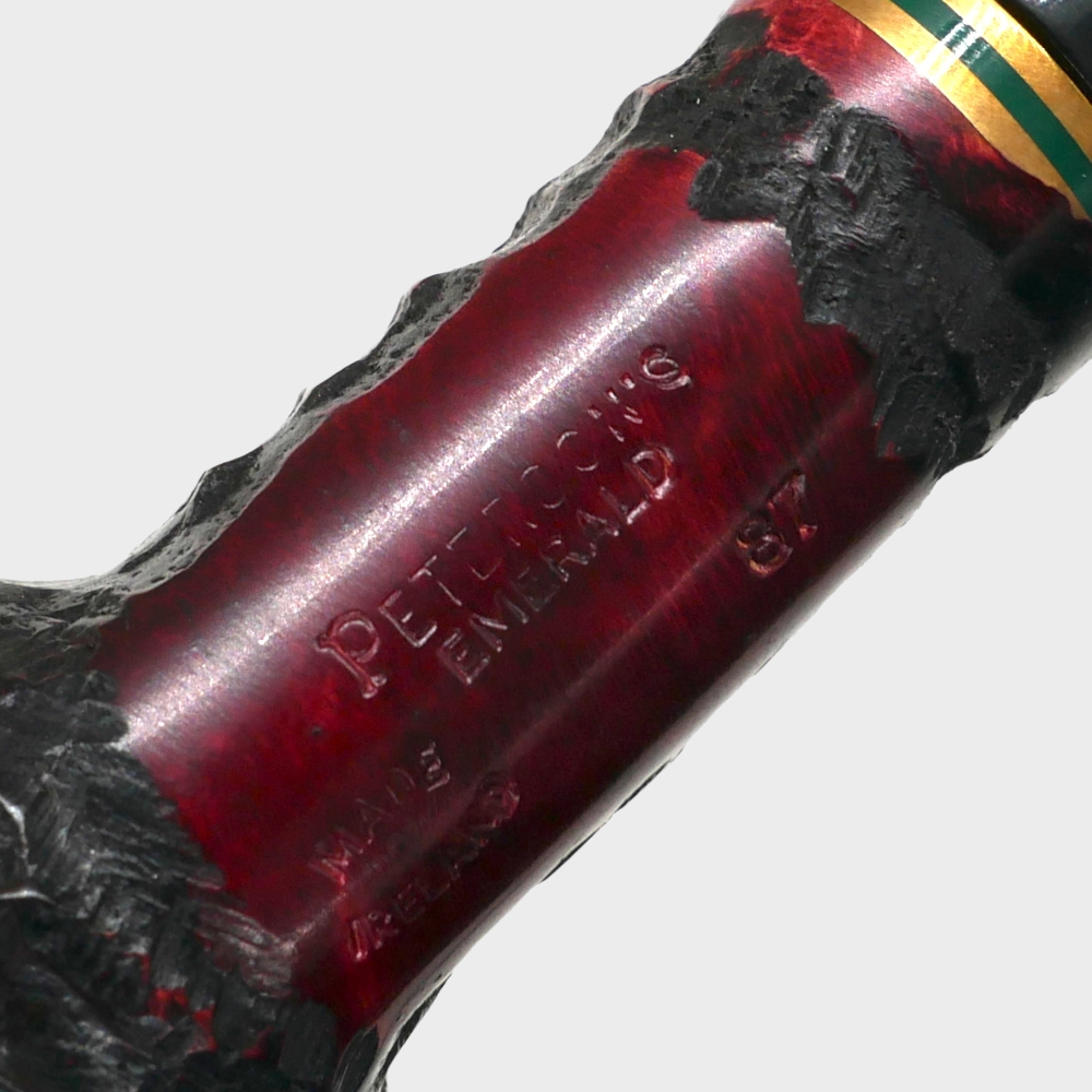 The Peterson Emerald Rustic Pipe range is made from specially selected hand carved briar in black with red hues and a twin gilt and emerald band.