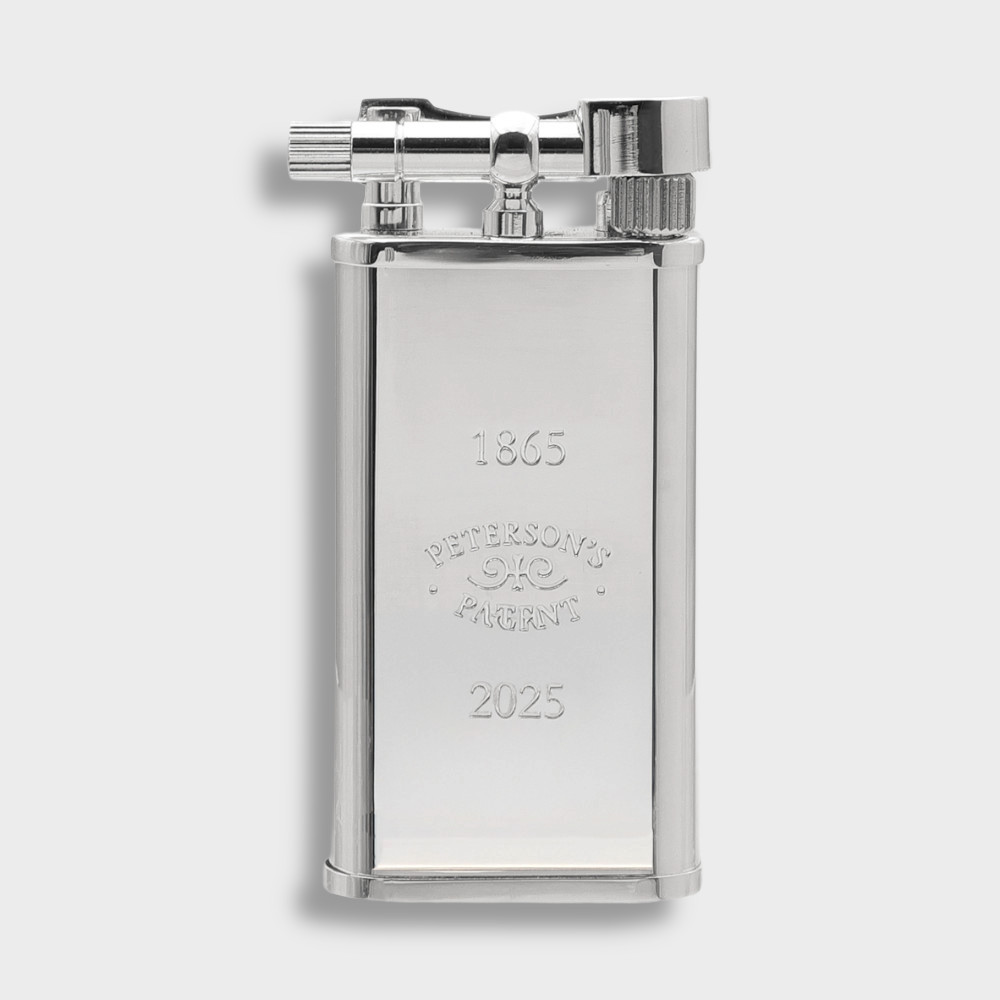 The body is crafted from smooth silver plating, with the front adorned by a stylized fork-tail "P" drawn from Peterson's past - a Celtic-inspired emblem that has appeared throughout the company's history. The back showcases a framed reproduction of an old Peterson patent logo, inspired by vintage pipe cases made in the factory around 1908, while subtle filigree lines along the body echo the detailing of those historic cases.
