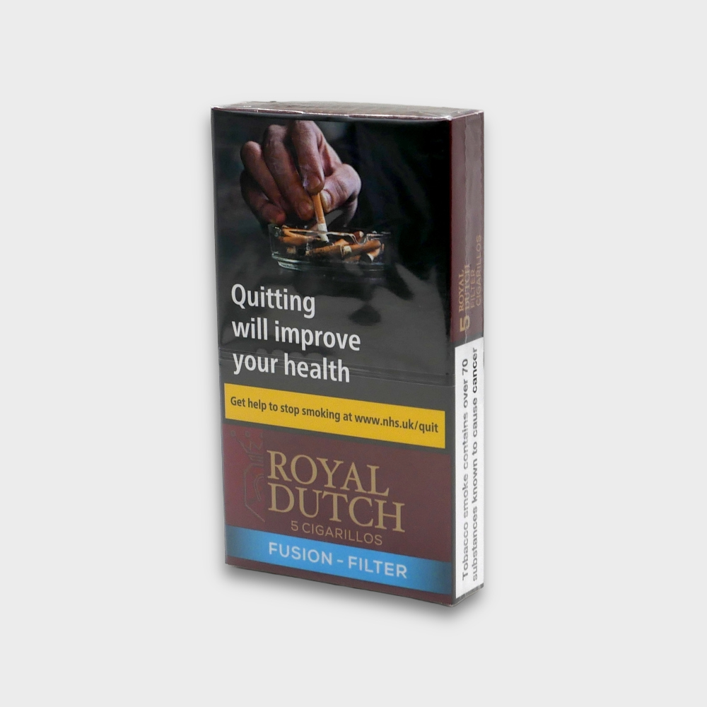 Introducing the newest and most innovative Royal Dutch cigarillo yet. The uniquely named and uniquely sized Royal Dutch Fusion. A mild Royal Dutch aromatic tobacco blend, with hints of dark fruit sweetness and an unparalleled depth of flavour. The sweet taste is infused with salted toffee caramel flavours. A truly unique sensory experience with many facets.