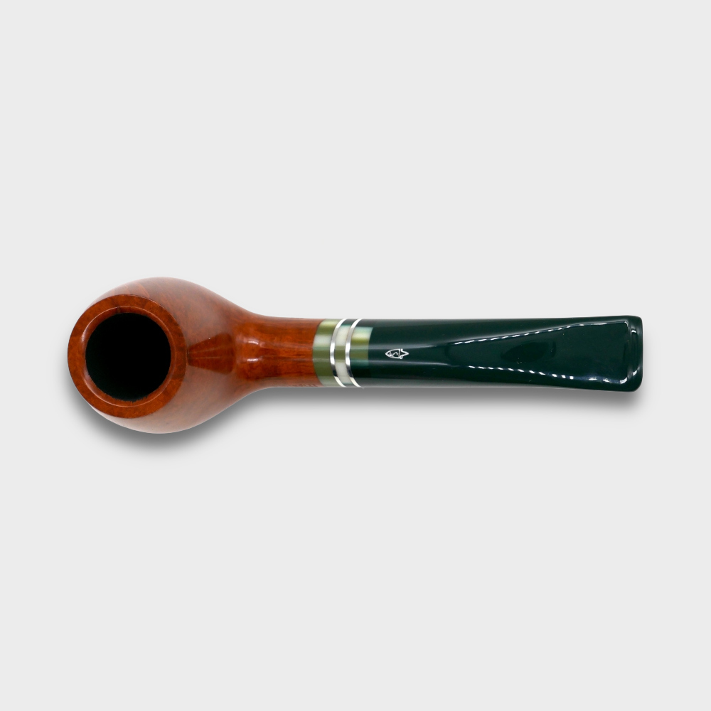 The Foresta series is available in 2 finishes: smooth natural and rusticated brown. A dark green acrylic stem with a playful trio of bands, with cream and green colours connected by a silver ring, characterize this elegant pipe.