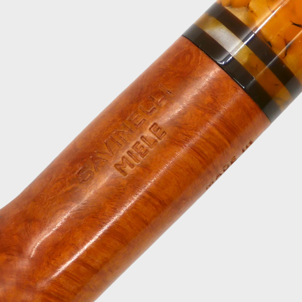 Savinelli Miele pipes are born from honey and its makers as miele is Italian for honey. The bowls are glossed, reminiscent of honey's shine. An amber acrylic stem adorns the pipe that looks like honeycomb, joined to the bowl by a black and yellow striped band. Alongside the pipe comes a honey dipper-inspired tamper to complete its sweet introduction.
