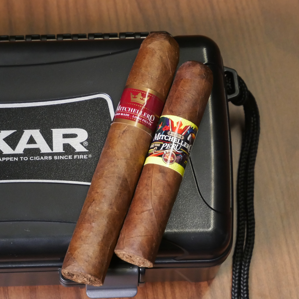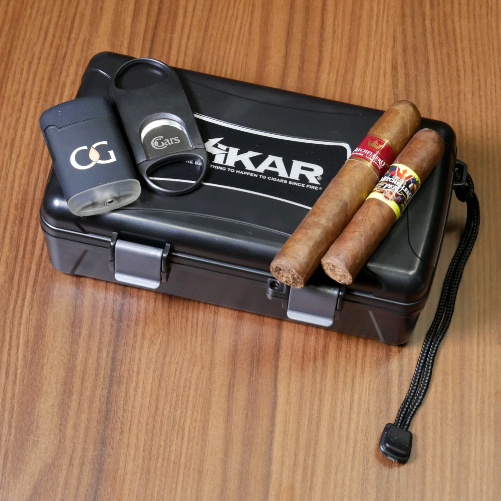 Elevate your journey with this cigar sampler, featuring two beautiful cigars housed in a sleek travel humidor, the perfect companion for a cigar lover on the move. Comes with a cutter and ligther to ensure you have everything you need on the go!