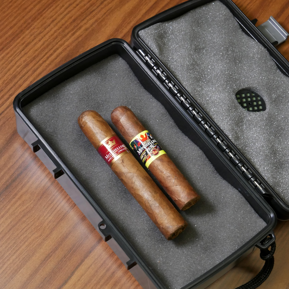 This humidor offers premium cigar protection, it's airtight, watertight and crush proof. Included is 1 mini humidifier and it has a super-strong ABS molded plastic construction with stainless steel hinge and latch hinges to really guarantee protection and safety. Not forgetting the molded lock ring for additional security with high density urethane foam cradles which allows your cigars to sit comfortably inside.