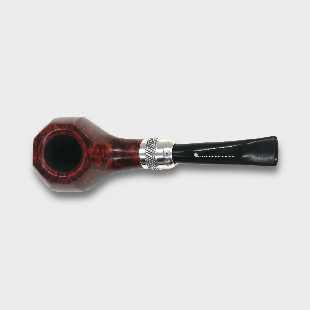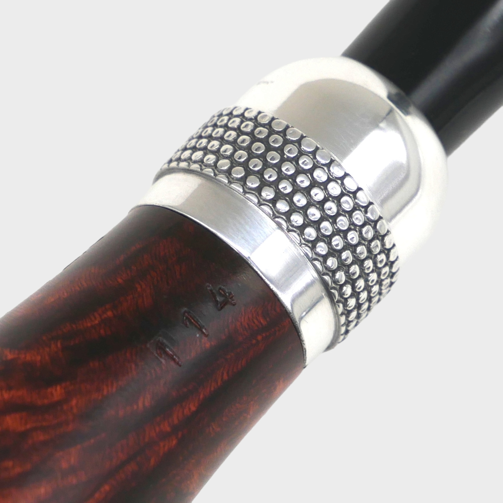 “Chianti” combines classic design with a reinterpreted olive-shaped silver ring on the stem – a detail that unites extravagance and tradition. The warm brown finish with a smooth wax polish highlights the natural grain of the briar wood.