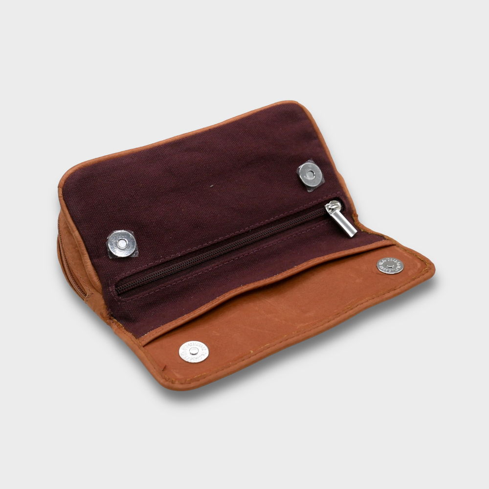 A compact pipe bag for one pipe and accessories. It features a separate compartment for loose tobacco as well as a zippered pocket for filters, cleaners, a lighter or other utensils. The main material is light brown leather with an embossed logo, securely closed with two magnetic snap buttons.
