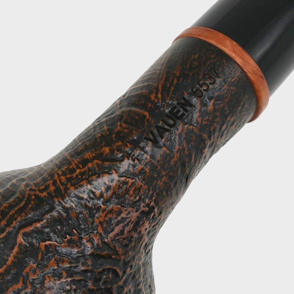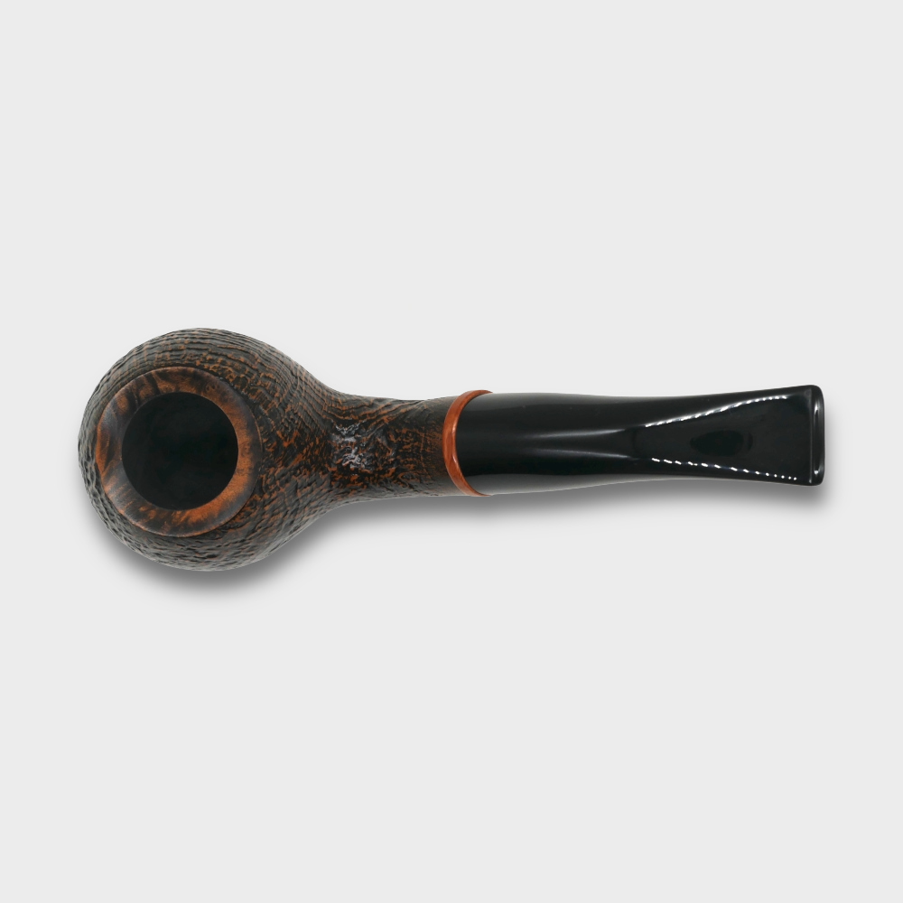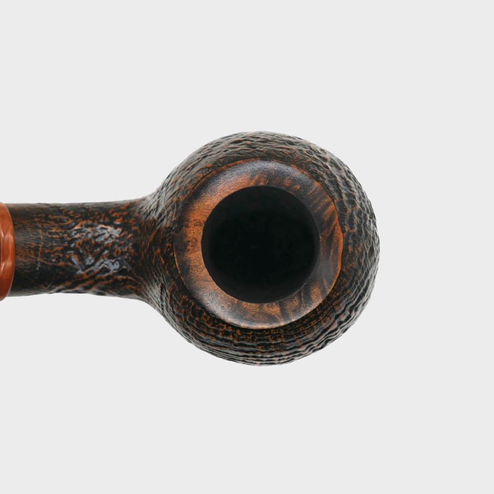 After the sandblasting, the Mamba pipe is stained completely black. Afterward, the tips of the relief-like surface are repolished by hand to bring out the natural brown of the briar wood. This brings about out a special depth of the grain in a terrific 3-D look. This special standard series is enhanced with a sublime briar wood ring as a special connecting piece from the stem to the mouthpiece.